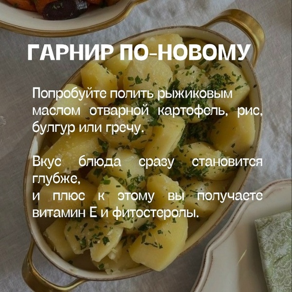 Попробуйте полить рыжиковым маслом отварной картофель, пис, булгур или гречу. Вкус блюда сразу становится глубже, и плюс к этому вы получаете витамин Е и фитостеролы.