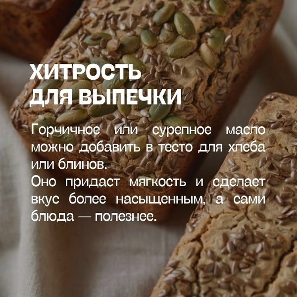 Горчичное или сурепное масло можно добавить в тесто для хлеба или блинов. Оно придаст мягкость и сделает вкус более насыщенным, а сами блюда - полезнее.